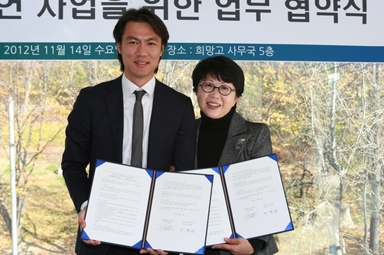 홍명보는 업무 체결 후 첫 번째 사업으로 희망고의 '마음 나눔 사업'에 동참해 내달 22일 열리는 선포식에 참여한다.