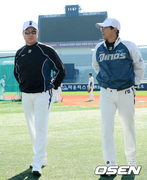 15일 오전 및 오후에 마산종합운동장 야구장에서 진행된 NC 다이노스의 훈련에서 NC 김경문 감독이 NC 최일언 투수 코치와 얘기를 나누고 있다.