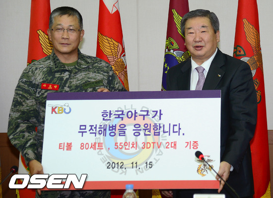 이날 KBO는 서해안 최전방 해병대 장병들이 야구를 간접적으로 즐기며 건전한 병영생활을 할 수 있도록 이호연 해병대 사령관에게 티볼 80세트와 55인치 3D 스마트 TV 2대를 전달했다.