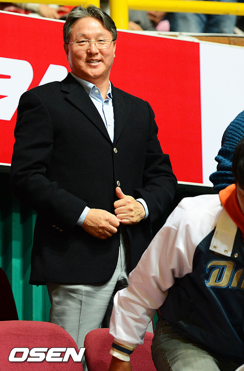 15일 저녁 경상남도 창원시 의장구 창원 실내체육관에서 열린 KB 국민카드 2012-2013 프로농구 창원 LG 세이커스와 부산 KT 소닉붐의 경기에서 NC 다이노스 선수들과 함께 경기장을 찾은 NC 김경문 감독이 환하게 웃고 있다.