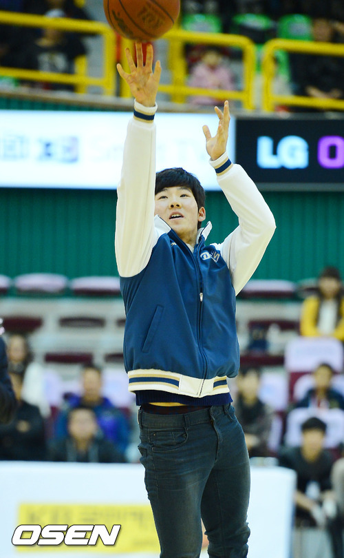 15일 저녁 경상남도 창원시 의장구 창원 실내체육관에서 열린 KB 국민카드 2012-2013 프로농구 창원 LG 세이커스와 부산 KT 소닉붐의 경기에서 이벤트 타임에 NC 김진성이 하프라인 슛을 쏘고 있다.
