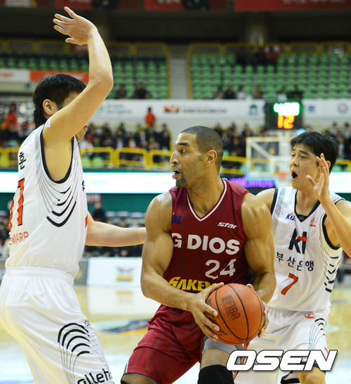 15일 저녁 경상남도 창원시 의장구 창원 실내체육관에서 열린 KB 국민카드 2012-2013 프로농구 창원 LG 세이커스와 부산 KT 소닉붐의 경기 1쿼터 KT 서장훈과 김도수가 LG 클라크를 막아서고 있다.