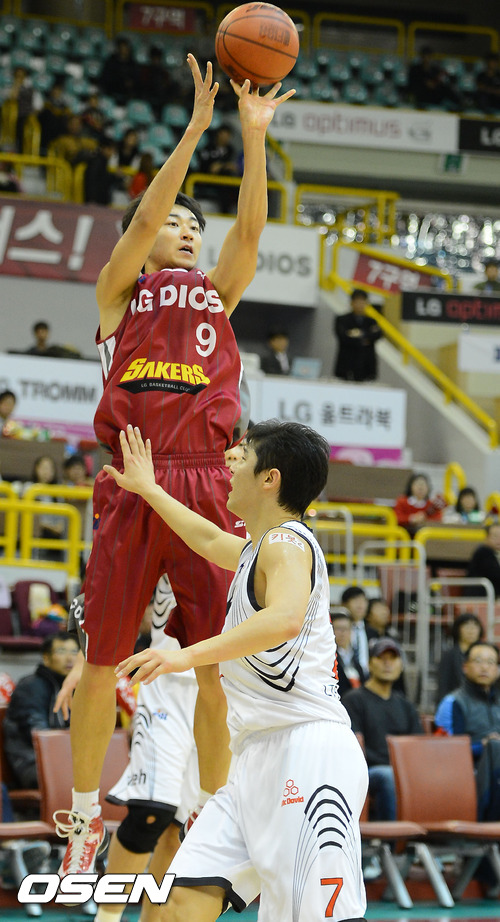 15일 저녁 경상남도 창원시 의장구 창원 실내체육관에서 열린 KB 국민카드 2012-2013 프로농구 창원 LG 세이커스와 부산 KT 소닉붐의 경기 2쿼터 LG 김영환이 3점슛을 날리고 있다.