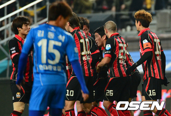 15일 오후 서울 마포구 성산동 서울월드컵경기장에서 열린 '현대오일뱅크 K리그 2012 39라운드' FC 서울과 울산 현대의 경기, 전반 서울 현영민이 골을 성공시키고 동료들과 환호하고 있다.