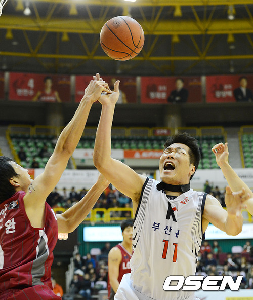 15일 저녁 경상남도 창원시 의장구 창원 실내체육관에서 열린 KB 국민카드 2012-2013 프로농구 창원 LG 세이커스와 부산 KT 소닉붐의 경기 4쿼터 서장훈이 레이업슛을 시도할때 파울을 당하고 있다.