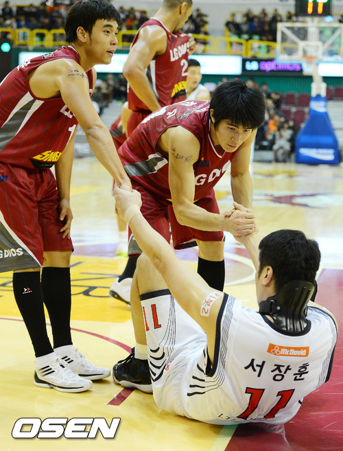 15일 저녁 경상남도 창원시 의장구 창원 실내체육관에서 열린 KB 국민카드 2012-2013 프로농구 창원 LG 세이커스와 부산 KT 소닉붐의 경기 4쿼터 KT 서장훈이 레이업슛을 시도할때 파울을 당한 후 LG 박래훈과 박진수가 서장훈을 일으켜 세우고 있다.