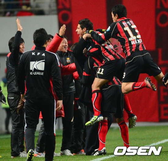 15일 오후 서울 마포구 성산동 서울월드컵경기장에서 열린 '현대오일뱅크 K리그 2012 39라운드' FC 서울과 울산 현대의 경기, 전반 서울 아디가 선제골을 성공시키고 동료들과 환호하고 있다.