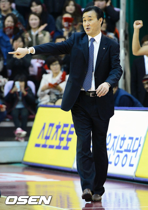 15일 저녁 경상남도 창원시 의장구 창원 실내체육관에서 열린 KB 국민카드 2012-2013 프로농구 창원 LG 세이커스와 부산 KT 소닉붐의 경기 4쿼터 LG 김진 감독이 지시를 내리고 있다.