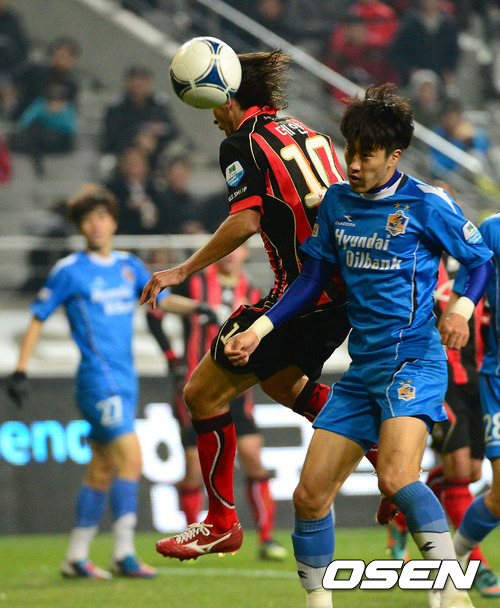 15일 오후 서울 마포구 성산동 서울월드컵경기장에서 열린 '현대오일뱅크 K리그 2012 39라운드' FC 서울과 울산 현대의 경기, 후반 서울 데얀이 센터링된 공을 향해 헤딩을 시도했으나 빗겨나가고 있다.