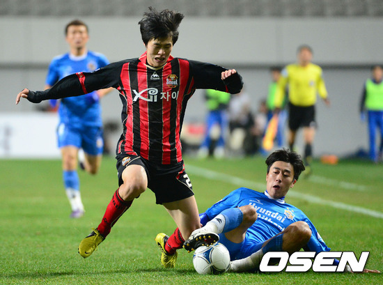 15일 오후 서울 마포구 성산동 서울월드컵경기장에서 열린 '현대오일뱅크 K리그 2012 39라운드' FC 서울과 울산 현대의 경기, 후반 서울 고명진이 울산 이재성의 태클에 걸려 넘어지고 있다.