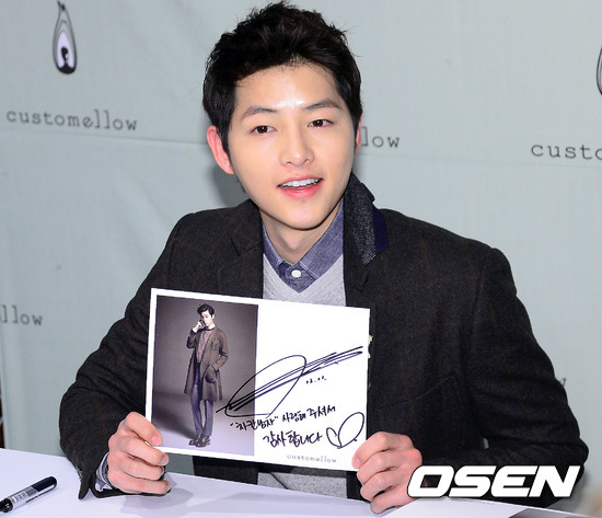 송중기가 16일 오후 서울 서교동 커스텀멜로우 홍대점에서 열린 자선파티 팬 사인회에서 송중기가 정성그럽게 사인한 사인보드를 들고 포토타임을 갖고 있다.