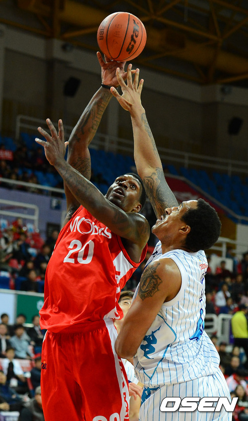 16일 저녁 울산광역시 중구 남외동 동천체육관에서 열린 KB 국민카드 2012-2013 프로농구 울산 모비스 피버스와 전주 KCC 이지스의 경기 1쿼터 모비스 라틀리프가 KCC 심스의 블로킹을 피해 레이업 슛을 성공시키고 있다.