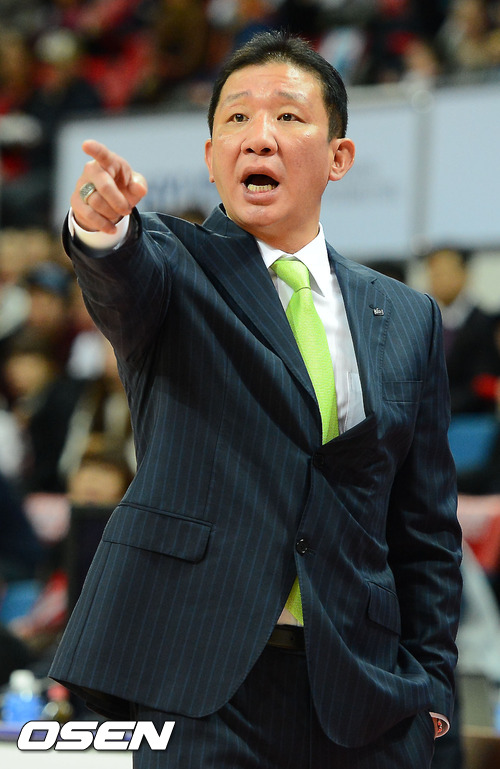 16일 저녁 울산광역시 중구 남외동 동천체육관에서 열린 KB 국민카드 2012-2013 프로농구 울산 모비스 피버스와 전주 KCC 이지스의 경기 1쿼터 KCC 허재 감독이 선수들을 다그치고 있다.