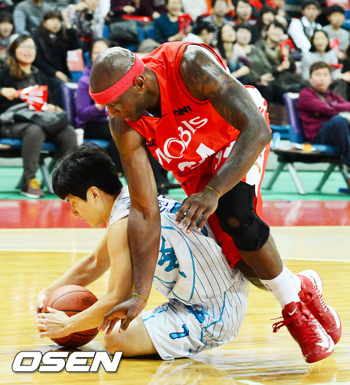 16일 저녁 울산광역시 중구 남외동 동천체육관에서 열린 KB 국민카드 2012-2013 프로농구 울산 모비스 피버스와 전주 KCC 이지스의 경기 2쿼터 KCC 정선구와 모비스 위더스가 볼다툼을 하던 중 모비스가 정선구의 몸 위로 넘어지고 있다.