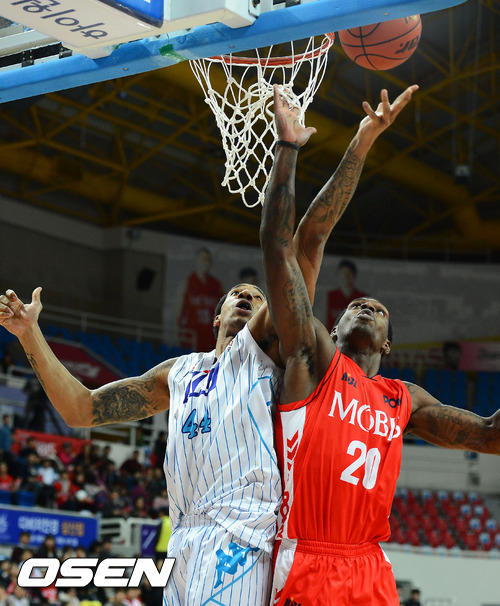 16일 저녁 울산광역시 중구 남외동 동천체육관에서 열린 KB 국민카드 2012-2013 프로농구 울산 모비스 피버스와 전주 KCC 이지스의 경기 3쿼터 KCC 심스와 모비스 라틀리프가 리바운드 다툼을 하고 있다.