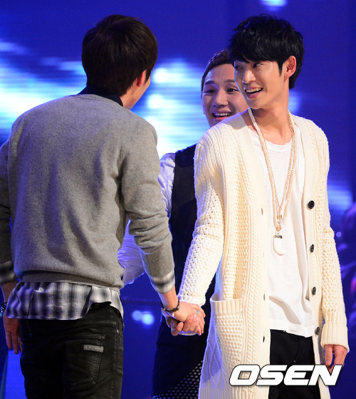 16일 오후 서울 동대문구 회기동 경희대학교 평화의전당에서 열린 '슈퍼스타K4 TOP3 생방송 공연'에서 정준영이 심사위원들에게 호평을 받은 로이킴을 응원하고 있다.