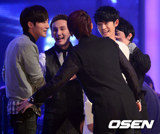 16일 오후 서울 동대문구 회기동 경희대학교 평화의전당에서 열린 '슈퍼스타K4 TOP3 생방송 공연'에서 정준영과 딕펑스가 심사위원들에게 호평을 받은 로이킴을 응원하고 있다.