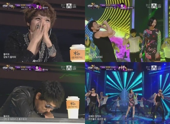 이들은 16일 오후 생방송된 '슈퍼스타K 4'에서 남성듀오 클론이 지난 1999년 발표했던 곡 '돌아와'를 개사해 선보였다. 정턱과 쾌남들, 박상보가 만드는 무대에 심사위원 이승철은 책상 위에 엎드린 채 폭소를 터트렸고 윤미래 역시 웃음을 참지 못하는 모습이었다.