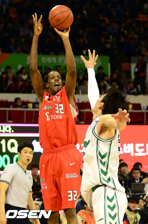 17일 오후 잠실학생체육관에서 열린 'KB 국민카드 2012-2013 프로농구' 서울 SK 나이츠와 원주 동부의 경기 2쿼터 SK 헤인즈가 동부 김주성을 앞에두고 점프슛을 시도하고 있다.