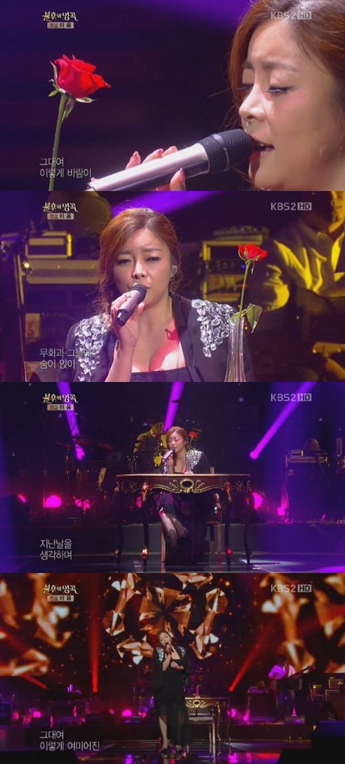 농염한 성숙미를 보여주겠다던 화요비는 꽃병에 한 송이 장미꽃이 꽂혀 있는 테이블에 앉아 특유의 허스키한 목소리로 노래를 불렀다.