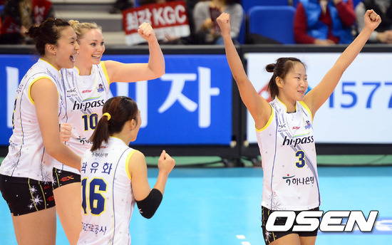 18일 오후 대전 충무체육관에서 열린 '2012-2013 NH농협 V-리그' 인삼공사와 도로공사의 경기 1세트 도로공사 선수들이 득점 후 환호하고 있다.