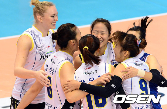 18일 오후 대전 충무체육관에서 열린 '2012-2013 NH농협 V-리그' 인삼공사와 도로공사의 경기 1세트 도로공사 선수들이 득점 후 기뻐하고 있다.