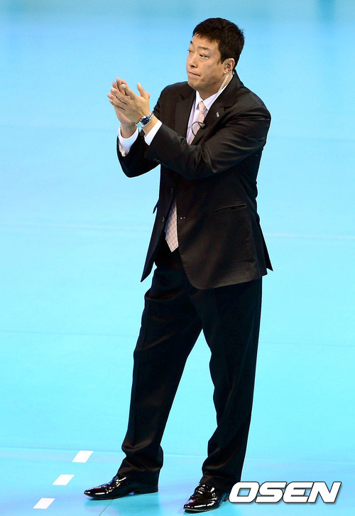 18일 오후 대전 충무체육관에서 열린 '2012-2013 NH농협 V-리그' 인삼공사와 도로공사의 경기 1세트 도로공사 어창선 감독이 선수들에게 박수를 보내고 있다.