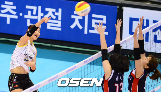 18일 오후 대전 충무체육관에서 열린 '2012-2013 NH농협 V-리그' 인삼공사와 도로공사의 경기 2세트 도로공사 곽유화가 공격을 시도하고 있다.