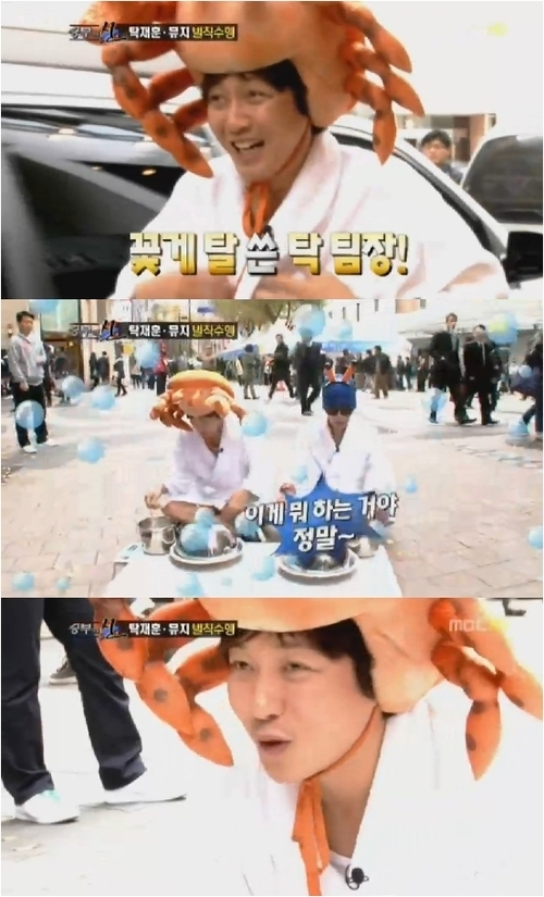 방송인 탁재훈과 그룹 UV 멤버 뮤지가 꽃게탈을 쓰고 명동 길거리에서 꽃게를 먹었다.