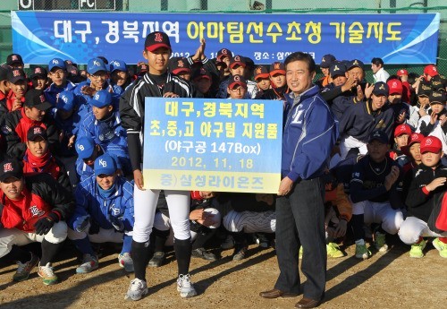 삼성은 18일 오후 1시 경산볼파크에서 대구, 경북지역의 21개 팀 초.중.고 선수들을 초청해 기술지도와 함께 지원품 전달 행사를 가졌다.