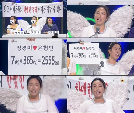 정경미는 자신과 윤형빈의 교제 기간을 밝히면서 “7년에 365일을 곱하면 2555일. 아우 징그러”라면서 “서로 생일도 모른다. 이 커플은 누구를 위한 커플이냐. 심진화는 잘 들어라. 머리에 피도 안 말랐다. 1000일 지나고 와. ‘사네’, ‘못 사네’ 할 때 소주 한 잔 사줄게 임마”라고 말해 웃음을 자아냈다.