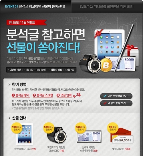 이번 이벤트는 '분석글 참고하면 선물이 쏟아진다!'와 '위너클럽 최고의 분석왕은 누구?' 2가지로 진행중이다.