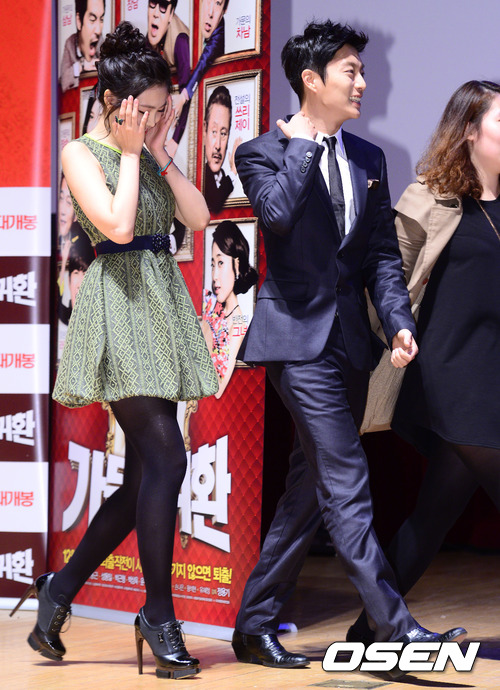 19일 오후 서울 건국대학교 새천년관에서 열린 '가문의귀환' 제작보고회에서 손나은과 윤두준이 포토월을 빠져나가고 있다.