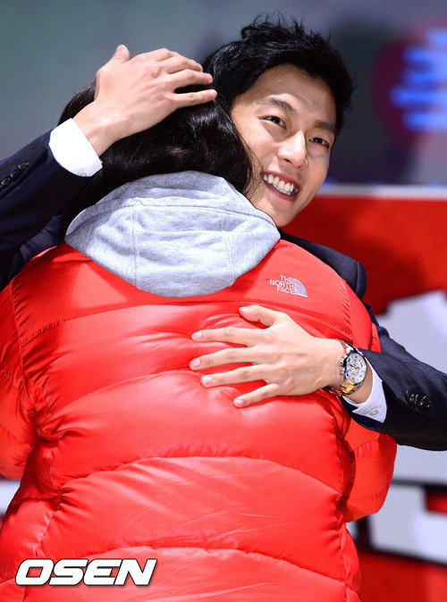 19일 오후 서울 건국대학교 새천년관에서 열린 '가문의귀환' 쇼케이스에서 윤두준이 추첨에 당첨된 팬과 포옹을 나누고 있다.