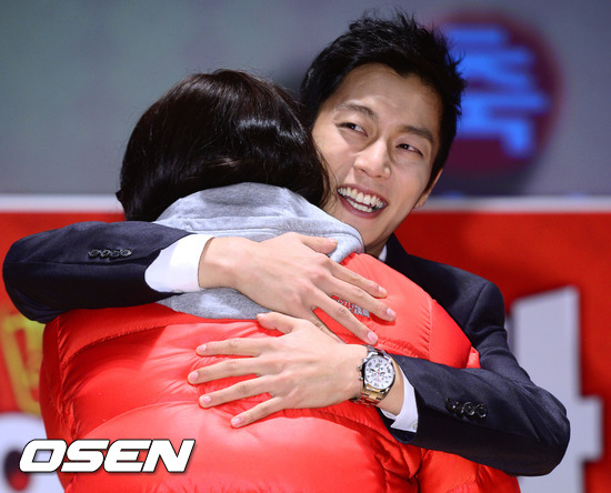 19일 오후 서울 건국대학교 새천년관에서 열린 '가문의귀환' 쇼케이스에서 윤두준이 추첨에 당첨된 팬과 포옹을 나누고 있다.