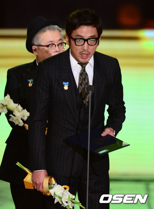 19일 오후 서울 송파구 방이동 올림픽공원 올림픽홀에서 열린 '2012 대한민국 대중문화예술상' 시상식에서 배우 하정우가 국무총리 표창을 수상하고 소감을 말하고 있다.