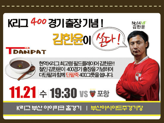 김한윤은 18일 제주전 출장을 통해 K리그 통산 9번째로 400경기 출장 기록을 달성했다. 이를 기념하기 위해 김한윤과 구단측에서는 깜짝 이벤트를 준비했다. 부산의 팥죽 업체인 더단팥과 함께 팬들을 위한 팥죽 400그릇을 준비해 팬들을 맞이할 예정이다.