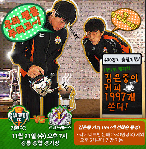 강원FC는 21일 오후 7시 강릉종합경기장에서 현대오일뱅크 K리그 2012 41라운드 전남 드래곤즈와 홈경기를 갖는다.특히 이날 경기 시작 전에는 김은중의 K리그 400경기 출전을 축하하는 기념식이 열린다. 이에 김은중은 1997년 프로에 데뷔한 이래로 지금껏 변함없는 지지를 보내주는 팬들을 위한 '사랑의 커피' 1997개를 쏠 예정이다.
