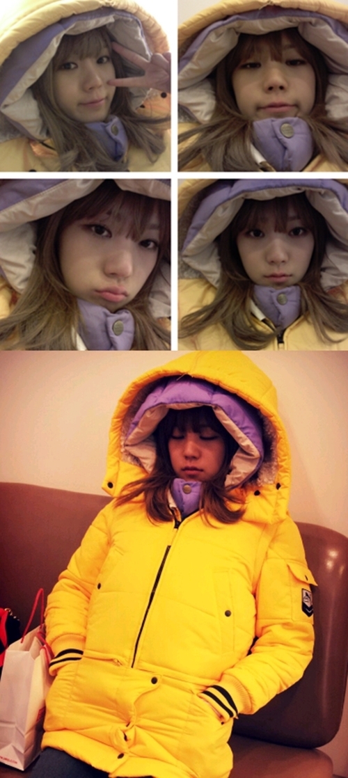 사진 속 리지는 보랏빛 패딩 점퍼와 노란 패딩 점퍼를 한꺼번에 입은 채 깜찍한 표정으로 카메라를 응시하고 있다. 리지의 조막만한 얼굴은 커다란 점퍼 덕분에 더욱 작아 보여 여성팬의 부러움을 사고 있다. 또 마치 노란 곰돌이처럼 귀여운 리지의 모습이 눈길을 끈다.