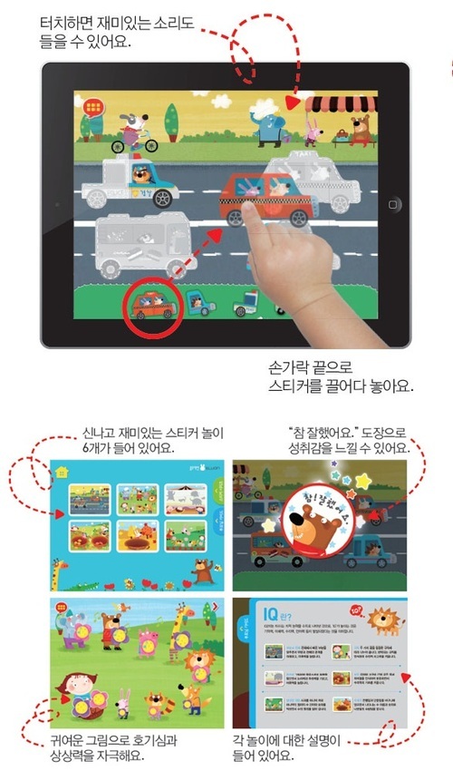 재미있는 스티커 놀이를 기반으로 제작 돼 엄마가 아이를 자연스럽게 학습에 참여하도록 유도할 수 있으며, 단계별로 논리적 사고를 키울 수 있다. 또한 미술활용 능력과 시각, 청각, 촉각을 모두 자극해 아이의 인지능력(IQ), 감성(EQ), 창의력(CQ)을 고루 발달시킬 수 있도록 구성됐다.