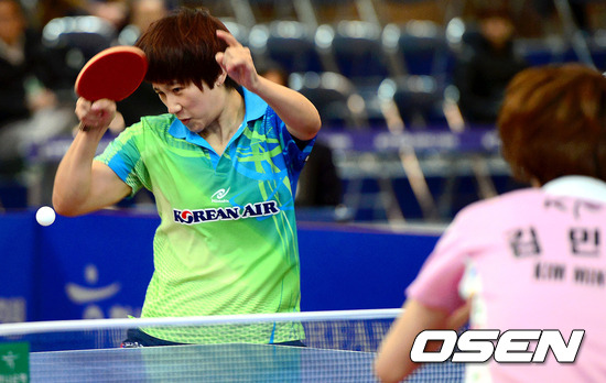 20일 오후 경기도 안양 호계체육관에서 열린 '하나은행 2012 MBC 탁구 최강전' 챔피언결정전 2차전 대한항공과 KRA 한국 마사회 단식 1번 경기에서 대한항공 석하정이 강력한 스매싱을 날리고 있다.