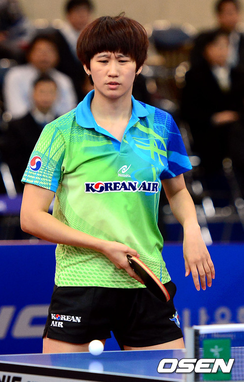 20일 오후 경기도 안양 호계체육관에서 열린 '하나은행 2012 MBC 탁구 최강전' 챔피언결정전 2차전 대한항공과 KRA 한국 마사회 단식 1번 경기에서 대한항공 석하정이 어이없는 실수로 점수를 내준뒤 아쉬운 표정을 짓고 있다.