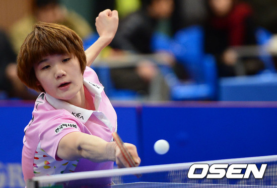 20일 오후 경기도 안양 호계체육관에서 열린 '하나은행 2012 MBC 탁구 최강전' 챔피언결정전 2차전 대한항공과 KRA 한국 마사회 단식 1번 경기에서 KRA 한국 마사회 김민희가 푸시 공격을 시도하고 있다.