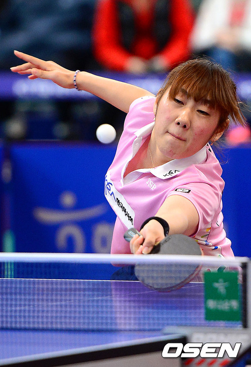 20일 오후 경기도 안양 호계체육관에서 열린 '하나은행 2012 MBC 탁구 최강전' 챔피언결정전 2차전 대한항공과 KRA 한국 마사회 단식 2번 경기에서 KRA 한국 마사회 박영숙이 가볍게 공을 받아넘기고 있다.