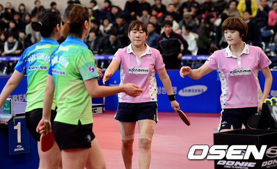 20일 오후 경기도 안양 호계체육관에서 열린 '하나은행 2012 MBC 탁구 최강전' 챔피언결정전 2차전 대한항공과 KRA 한국 마사회 복식 3번 경기에서 KRA 박영숙, 김민희가 승리를 거둔뒤 대한항공 심새롬, 박성혜와 악수를 하고 있다.