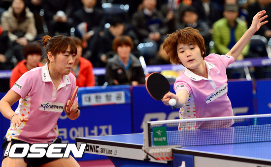 20일 오후 경기도 안양 호계체육관에서 열린 '하나은행 2012 MBC 탁구 최강전' 챔피언결정전 2차전 대한항공과 KRA 한국 마사회 복식 3번 경기에서 KRA 한국 마사회 김민희가 푸시 공격을 시도하고 있다.