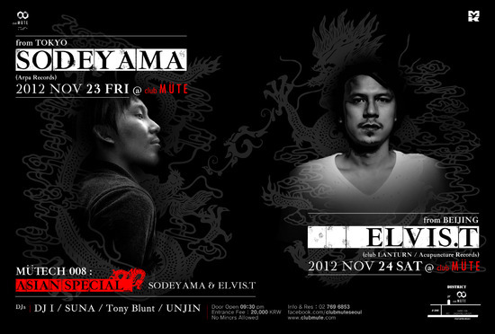 소데야마와 엘비스티는 오는 23~24일 양일간 서울 용산구 이태원에 위치한 디스트릭트(DISTRICT) 내 클럽 뮤트 (club MUTE)에서 일렉트로닉 파티 '뮤테크 (MUTECH)'를 펼친다.