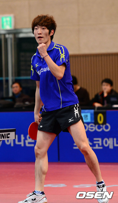 20일 오후 경기도 안양 호계체육관에서 열린 '하나은행 2012 MBC 탁구 최강전' 챔피언결정전 2차전 삼성생명과 KGC 인삼공사 단식 1번 경기에서 KGC 인삼공사 김민석이 승리를 거둔뒤 기뻐하고 있다.