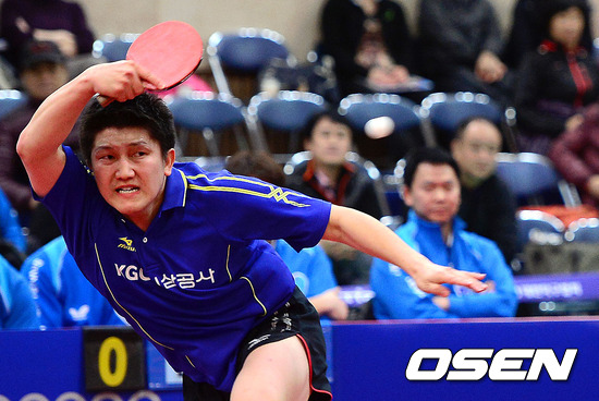 20일 오후 경기도 안양 호계체육관에서 열린 '하나은행 2012 MBC 탁구 최강전' 챔피언결정전 2차전 삼성생명과 KGC 인삼공사 단식 2번 경기에서 KGC 인삼공사 김정훈이 공을 살려내고 있다.