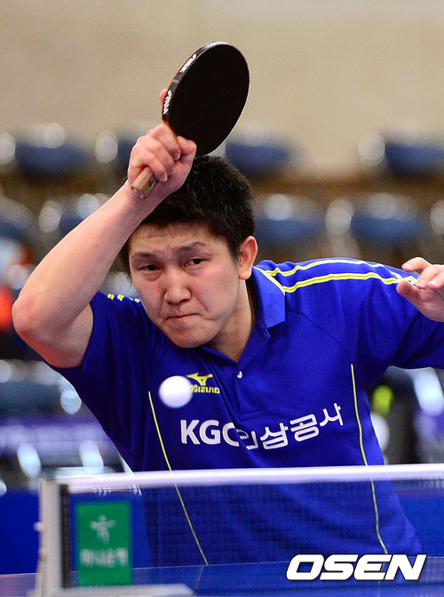 20일 오후 경기도 안양 호계체육관에서 열린 '하나은행 2012 MBC 탁구 최강전' 챔피언결정전 2차전 삼성생명과 KGC 인삼공사 단식 2번 경기에서 KGC 인삼공사 김정훈이 드라이브를 날리고 있다.